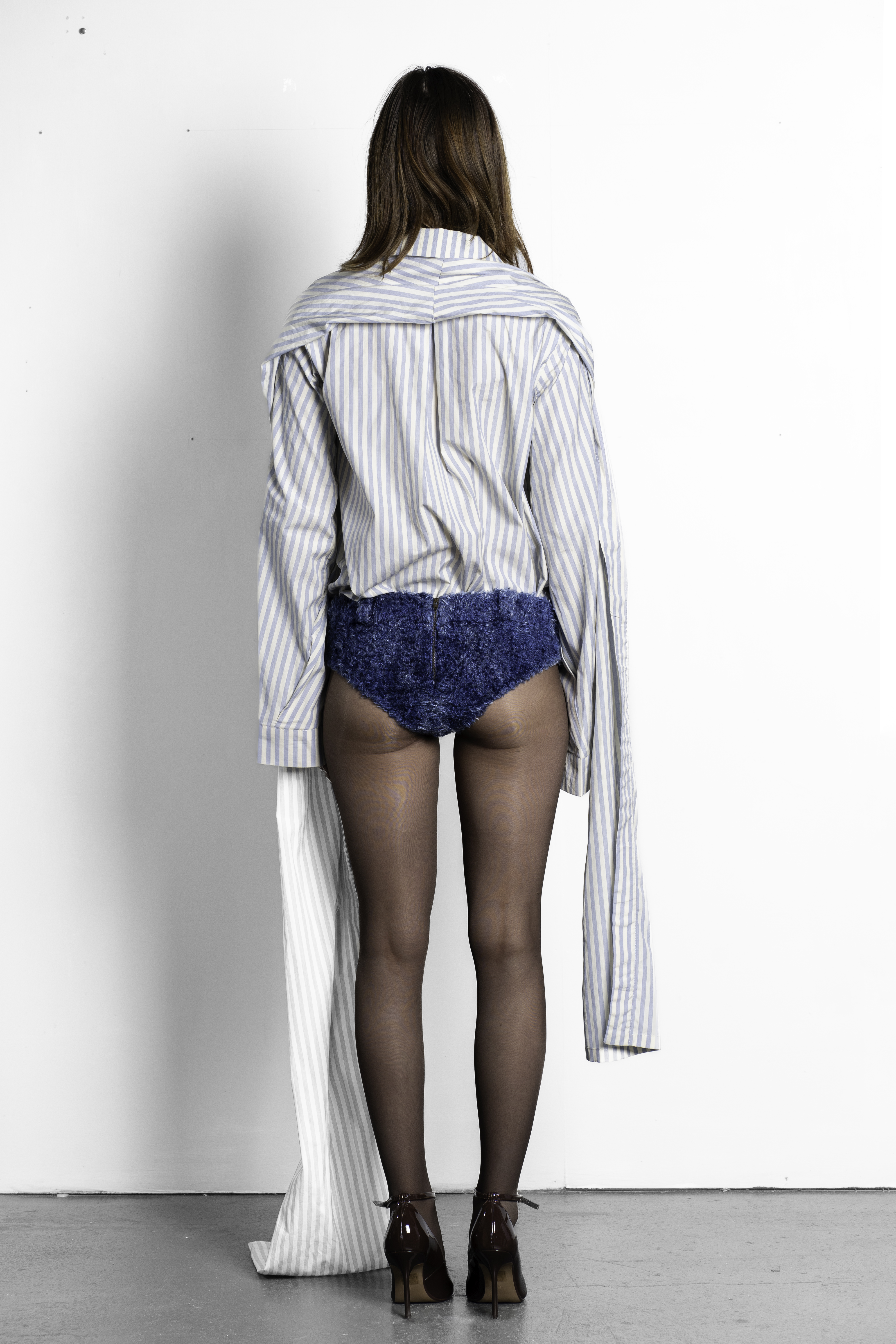 Faded indigo hot pant style mini made from fluffy ISKO denim.