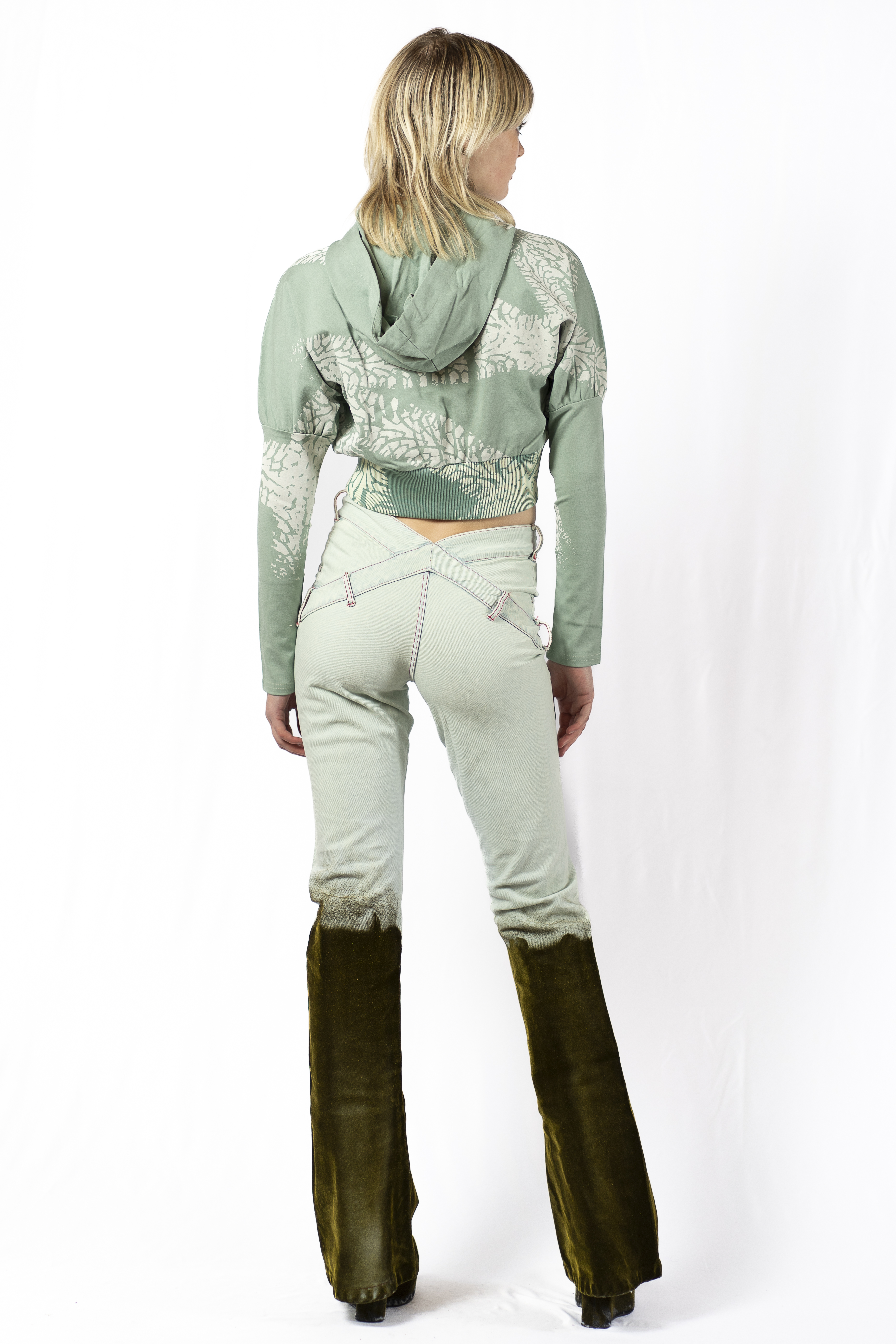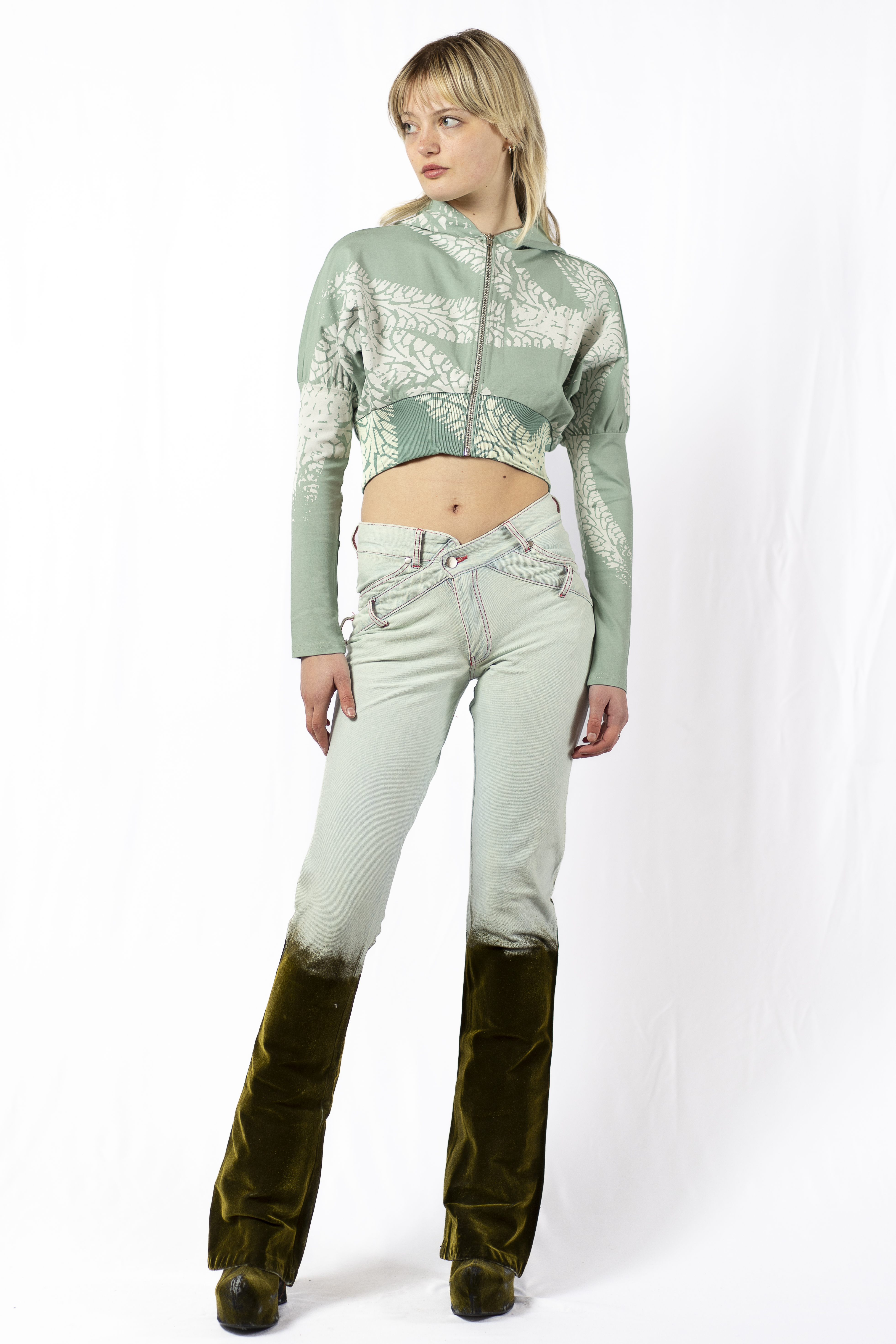 Non-stretch cotton denim jeans featuring gold flock "mud splatters" on the bottom.