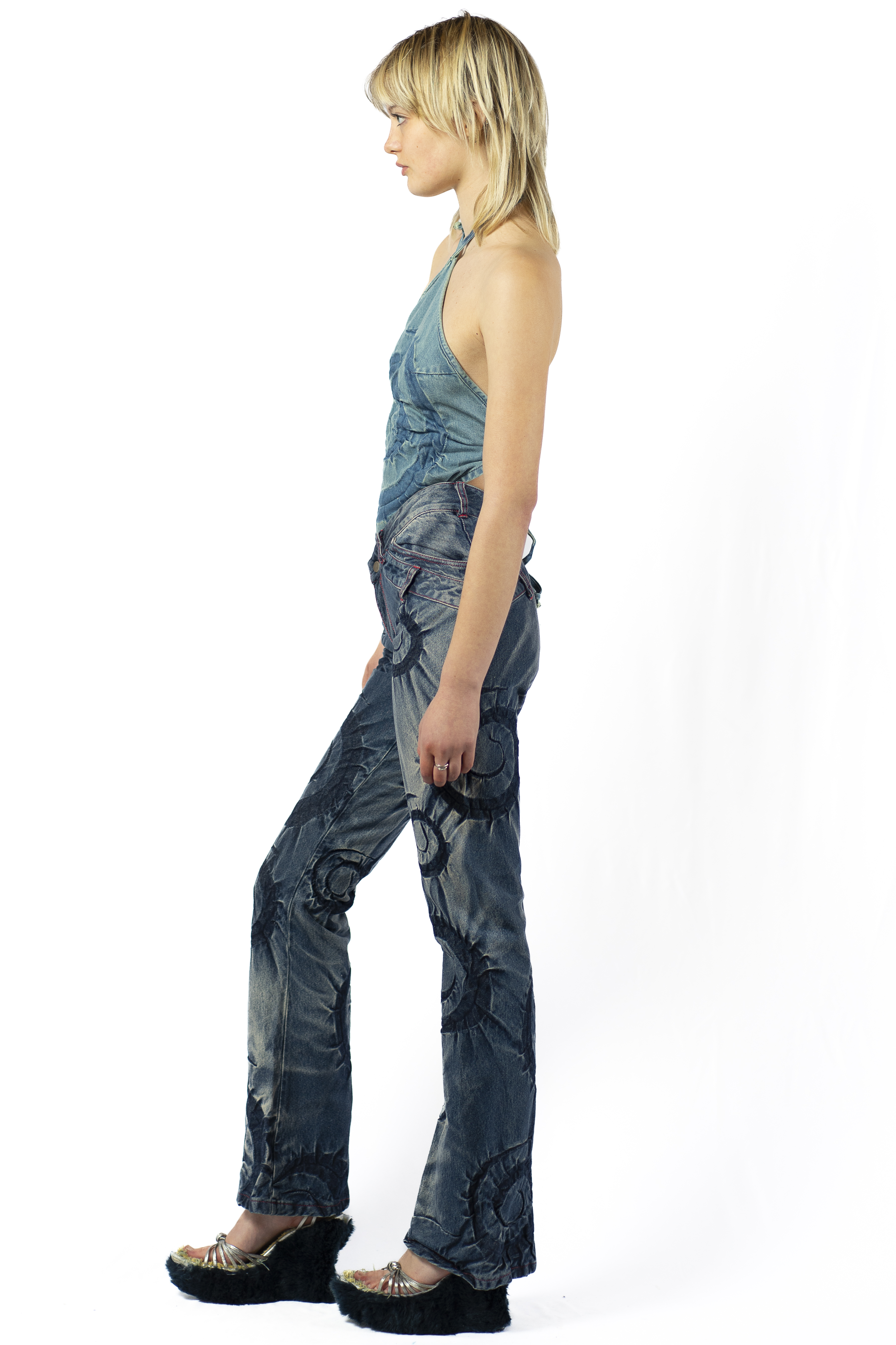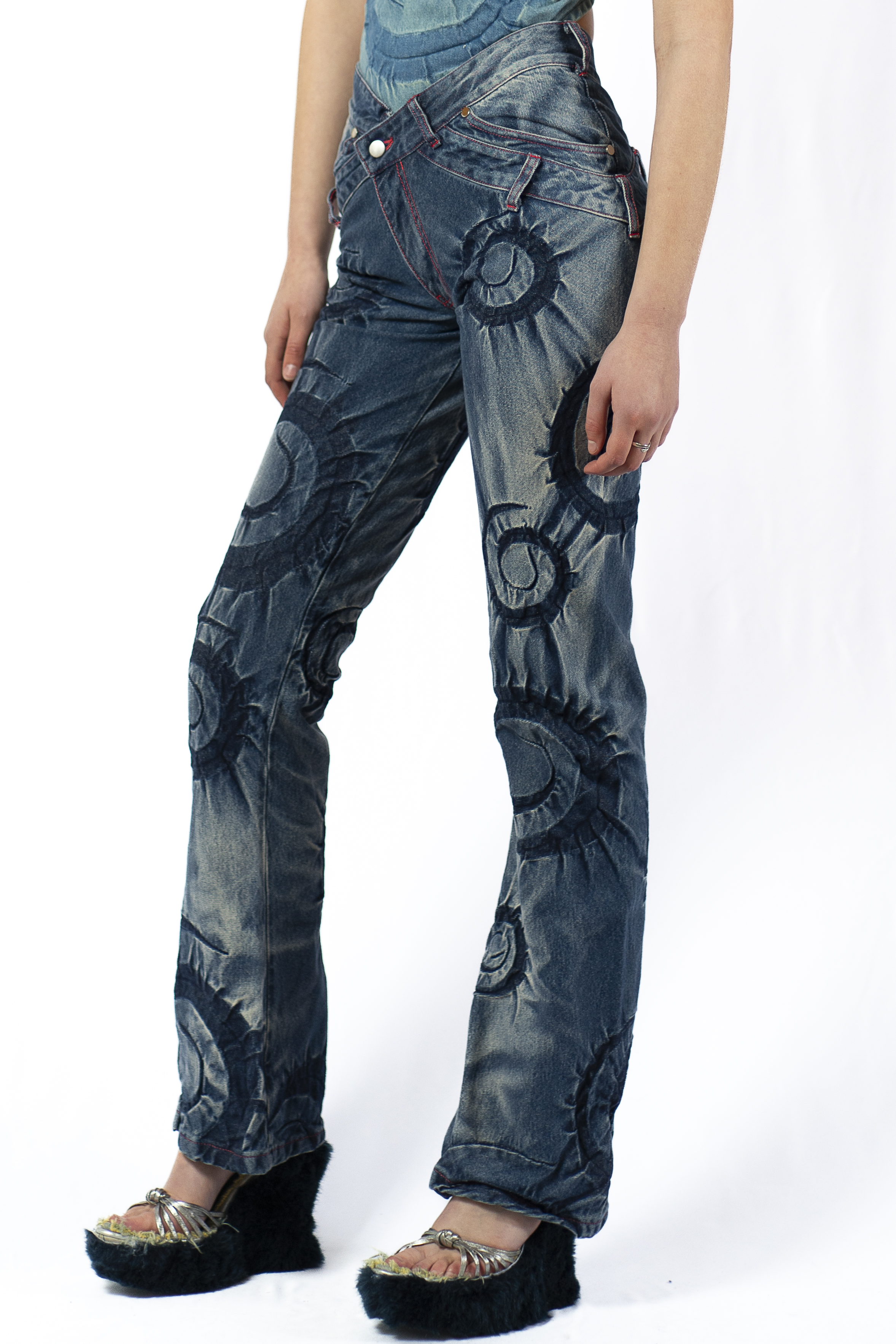 Non-stretch organic cotton denim jeans. Fading, overdying and graphic spiral pattern throughout.